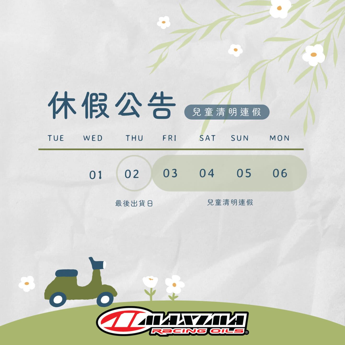 NEWS 最新消息 首頁 最新消息 公告資訊 更多消息 全部消息 公告資訊 活動資訊 2026-03-31 兒童清明連假公休 兒童清明連假公休 休假期間客服服務/出貨暫停 #maxima #美式馬機油 #兒童清明連假 MORE 2026-02-25 228連假公告 228連假公告 #maxima #美式馬機油 #競航國際有限公司 #228連假 MORE 1 | 共 1 頁